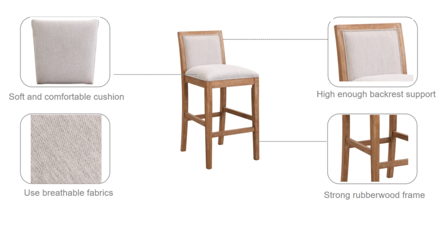 DURABILITY: Upholstered in durable, easy-to-clean 100% quality polyester fabric, the counter stools offer plush seating for comfortability, while the sturdy rubberwood frame ensures long-lasting support. Whether you're hosting guests for dinner or lounging in comfort on your own, this counter stool is a smart solution for modern living.